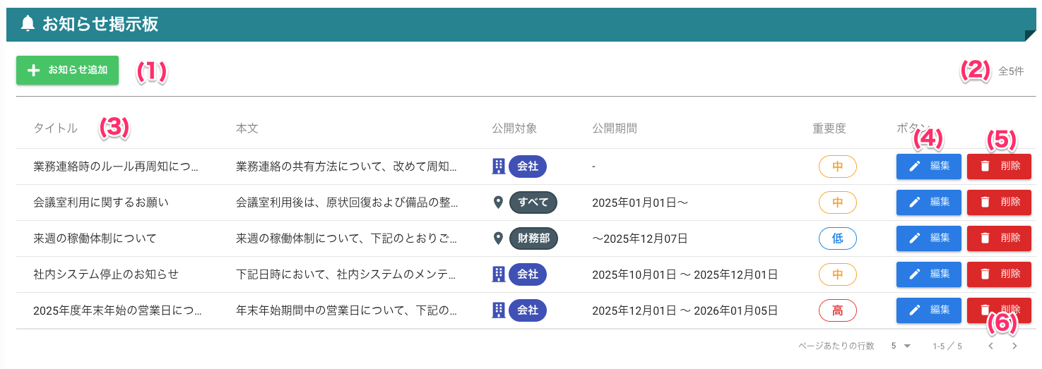 | 5 | 削除ボタン | - | 選択したお知らせを削除します(確認ダイアログあり) |